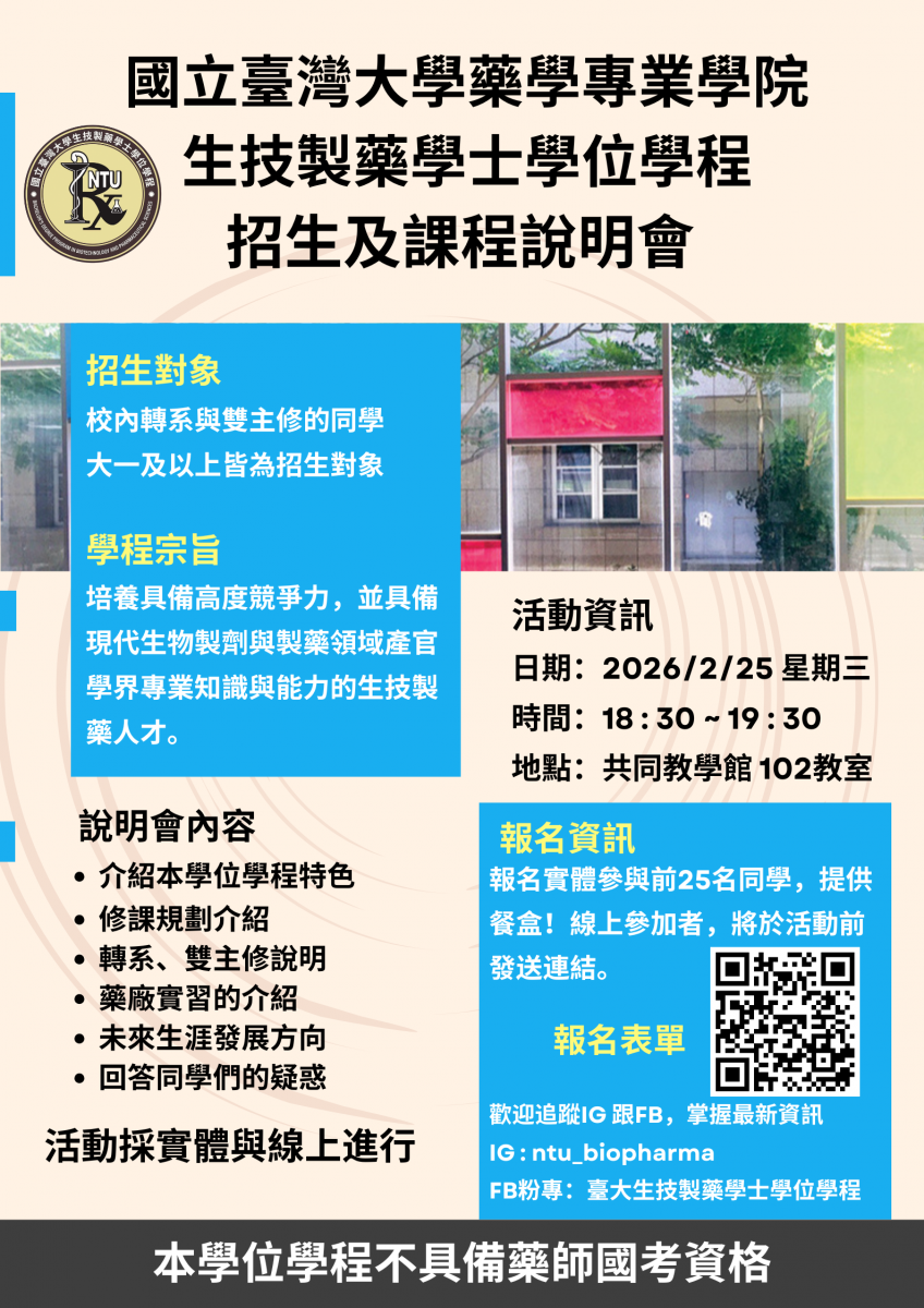 國立臺灣大學藥學專業學院新設立「生技製藥學士學位學程」